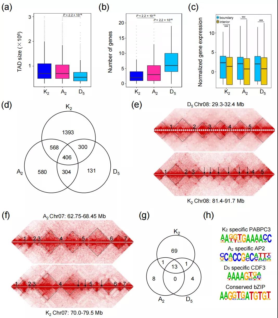 拓撲結(jié)構(gòu)域(TAD)是位于A/B compartment內(nèi)的較小域,表現(xiàn)出頻繁的域內(nèi)相互作用,與位于域外的位點的相互作用頻率較低。由于TAD邊界的轉(zhuǎn)換可以指示結(jié)構(gòu)重組,作者比較了共線區(qū)中的TAD邊界,以探索三個基因組中的TAD保護和轉(zhuǎn)換。研究發(fā)現(xiàn),在三個基因組中,K2中有406個TAD邊界是保守的,并且隨著TAD總數(shù)的增加,譜系特異性邊界的數(shù)量增加。K2基因組在TAD邊界的基因數(shù)最少,而D5的基因數(shù)最多(圖5)。大約60%的拓撲結(jié)構(gòu)域(TAD)在三個基因組中發(fā)生了重新組織,K2基因組中有更多特異的TAD。TAD邊界處的motif分析顯示69個特定于K2的motif,但A2和D5中分別只有8個和4個特定motif。