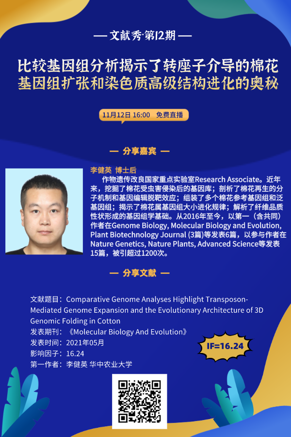 為了更好的分享熱門科研進展與研究經(jīng)歷,助力科研解讀基因,百邁客特邀李健英博士,于11月12日以直播的形式,為我們分享棉花轉(zhuǎn)座子與基因組三維結(jié)構(gòu)進化的奧秘(掃描圖中二維碼即可免費報名參與)。