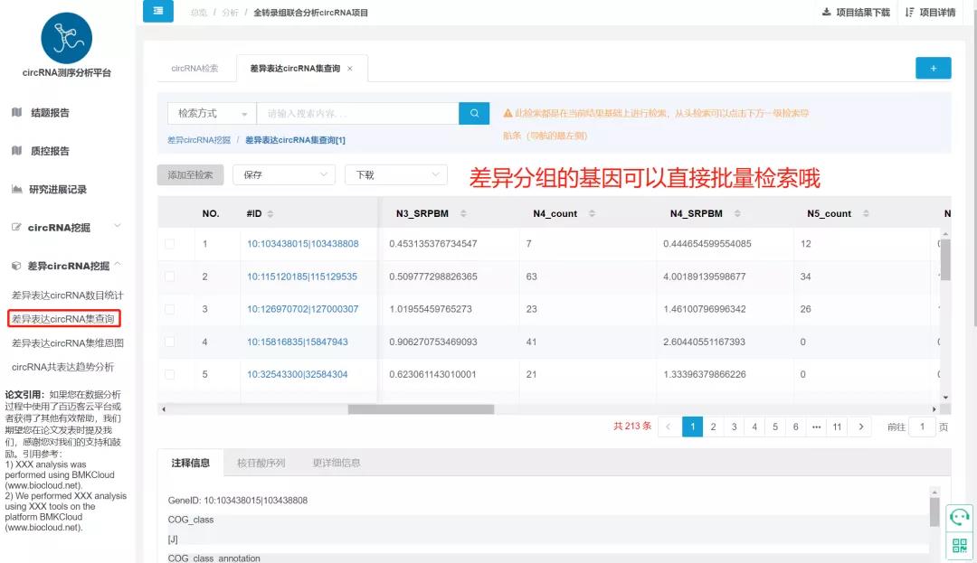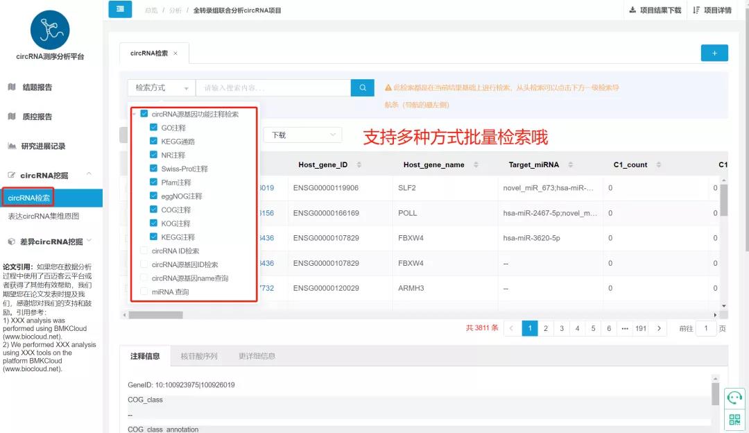 CircRNA的功能分析主要依靠于來源基因的功能注釋,如何在海量的數(shù)據(jù)中直接找到關(guān)心的目的基因呢?首先就是根據(jù)功能注釋進(jìn)行檢索,百邁客云平臺(tái)的CircRNA分析平臺(tái)中,支持針對(duì)結(jié)果根據(jù)八大功能數(shù)據(jù)庫(kù)的注釋信息批量檢索相關(guān)注釋基因、并且批量提取相關(guān)信息;靶向關(guān)系的預(yù)測(cè)也是關(guān)鍵circRNA檢索的必要一步,CircRNA分析平臺(tái)同時(shí)支持通過miRNA的ID批量提取相關(guān)靶向的CircRNA信息,此外,CircRNA ID、來源基因ID、來源基因name等功能,通過上傳ID文件均可實(shí)現(xiàn)批量查詢,甚至可以批量下載序列文件,省去多個(gè)文件來回切換的繁雜操作,一鍵式提取關(guān)鍵信息!