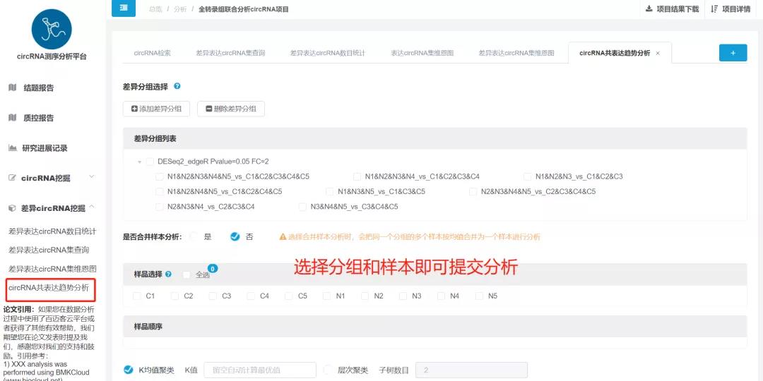 共表達(dá)分析常用于識(shí)別差異表達(dá)基因的共表達(dá)模式,分析各樣品間CircRNA表達(dá)豐度的不同變化模式,將相同表達(dá)趨勢(shì)的CircRNA劃分為一個(gè)數(shù)據(jù)集,通常我們認(rèn)為,具有相同表達(dá)變化趨勢(shì)的基因的功能互有關(guān)聯(lián),所以通過分析CircRNA的共表達(dá)趨勢(shì)分析,可以進(jìn)一步篩選出項(xiàng)目中關(guān)鍵的基因集合。CircRNA分析平臺(tái)搭載了共表達(dá)分析個(gè)性化,簡(jiǎn)單的選擇基因集合以及樣本即可完成分析。