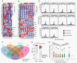 蛋白質(zhì)編碼基因、不同等位基因和顯性表達(dá)的雙等位基因的密度,發(fā)現(xiàn)它們都傾向于富集在高度雜合的區(qū)域,通常位于染色體的一端或兩端附近。通過對(duì)不同種植時(shí)間和組織部位的轉(zhuǎn)錄組分析發(fā)現(xiàn)除了第1、15和17對(duì)染色體外,幾乎所有同源染色體對(duì)中,雙等位基因間廣泛發(fā)生表達(dá)不平衡,并且淀粉和蔗糖代謝途徑上的雙等位基因表現(xiàn)出顯著的表達(dá)分化;