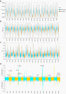 通過同源染色體比對,鑒定到3,107,171 個SNPs、 500,018 個indels、57,643 個PAVs以及632 個倒位。高雜合度區(qū)域的進化速度比其他區(qū)域更快。