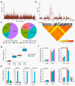 R1周圍雜合性降低的選擇信號,并且MeTIR1在攜帶GG等位基因的材料中的表達顯著高于攜帶CG和CC等位基因的材料(圖4i),說明MeTIR1純合變異促使塊根淀粉含量提升。并通過瞬時過表達和沉默技術(shù)進一步驗證了MeTIR1在木薯中的功能。進一步結(jié)合關(guān)聯(lián)分析發(fā)現(xiàn),對2號染色體攜帶MeAHL17 AA等位基因的材料,經(jīng)選擇馴化促使塊根產(chǎn)量提升的同時導致木薯細菌性枯萎病抗性丟失。