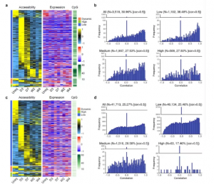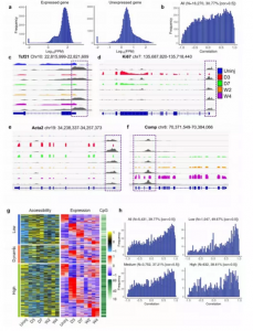 然后根據(jù)檢測(cè)到的啟動(dòng)子的可及性對(duì)它們進(jìn)行分類:高可及性組,低可及性組和動(dòng)態(tài)可及性組。發(fā)現(xiàn)在三個(gè)組中,很多基因的啟動(dòng)子可及性和轉(zhuǎn)錄水平有很強(qiáng)的相關(guān)性,但是在高可及性組中有一些基因的啟動(dòng)子可及性和轉(zhuǎn)錄組水平有著較弱的或者無(wú)相關(guān)性。有趣的是,具有高啟動(dòng)子可及性的基因具有最高的CpG密度,而具有低啟動(dòng)子可及性的基因具有最低的CpG密度(圖4g)。當(dāng)根據(jù)啟動(dòng)子中的CpG密度將5,431個(gè)差異表達(dá)基因分為3組時(shí),發(fā)現(xiàn)CpG密度較低但具有很強(qiáng)的正相關(guān)性的基因占比最高,進(jìn)一步表明DNA甲基化可以獨(dú)立調(diào)控基因轉(zhuǎn)錄,而與啟動(dòng)子染色質(zhì)可及性無(wú)關(guān)(圖4h)。