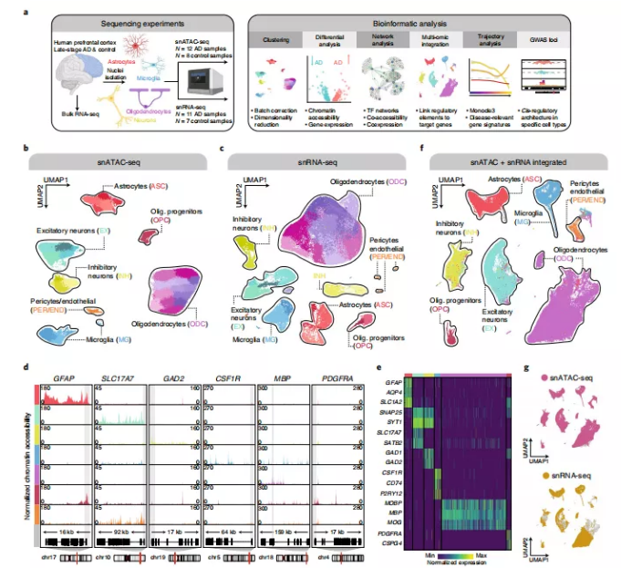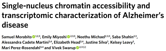 ATAC-seq是檢測組織內(nèi)開放的染色質(zhì)區(qū)域。迄今為止,單細(xì)胞染色質(zhì)可及性技術(shù),如單核ATAC-seq (snATAC-seq),很少用于疾病組織的原始樣本,因此,研究人員對同一AD患者死后的腦組織樣本同時(shí)進(jìn)行了snATAC-seq和snRNA-seq,以在表觀基因組和轉(zhuǎn)錄組水平揭示AD相關(guān)基因調(diào)控程序,并為研究大腦的細(xì)胞異質(zhì)性提供了一個(gè)新方法,并且能夠揭示特定細(xì)胞群中神經(jīng)退化的新途徑。