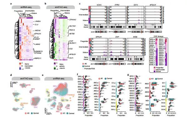 研究者進(jìn)行了snATAC-seq (10×Genomics;12例晚期AD、8例對照)和snRNA-seq (10×Genomics v3;11例晚期AD、7例對照組),使用從晚期AD患者和年齡匹配的認(rèn)知健康對照組(74-90歲以上;圖1a)。根據(jù)Braak分期和斑塊分期定義了晚期AD和對照。從同一組織樣本分別生成轉(zhuǎn)錄組和表觀遺傳學(xué)數(shù)據(jù),以減少兩種方法之間的細(xì)胞類型組成差異。經(jīng)過質(zhì)控過濾后,對130418個(gè)細(xì)胞核進(jìn)行snATAC-seq,61472個(gè)細(xì)胞核進(jìn)行snRNA-seq。為了保證研究的嚴(yán)謹(jǐn)性,對這兩種方法的數(shù)據(jù)采用了批量校正。對于snATAC-seq,使用了相互最近鄰(MNN)來校正潛在的semantic indexing來降低的染色質(zhì)可達(dá)性;對于snRNA-seq,使用了整合非負(fù)矩陣因子分解(iNMF)來降維,同時(shí)消除批次效應(yīng)。將UMAP降維和Leiden聚類應(yīng)用到批量校正的表觀基因組和轉(zhuǎn)錄組數(shù)據(jù)中,在snATAC-seq和snRNA-seq中識別到了不同的細(xì)胞類型(圖1b、c)。利用snATAC-seq,分析了腦的所有主要細(xì)胞類型——興奮性神經(jīng)元(24076個(gè)細(xì)胞核,EX.a-e)、抑制神經(jīng)元(9644個(gè)細(xì)胞核,INH.a-d)、星形膠質(zhì)細(xì)胞(15399個(gè)細(xì)胞核,ASC.a-f)、小膠質(zhì)細(xì)胞(12232個(gè)細(xì)胞核,MG.a-e)、少突膠質(zhì)細(xì)胞(62253個(gè)細(xì)胞核,ODC.a-m)和少突膠質(zhì)細(xì)胞前體細(xì)胞(4869個(gè)細(xì)胞核;OPC.a),基于已知標(biāo)記基因啟動子區(qū)域的染色質(zhì)可及性進(jìn)行注釋。同時(shí)使用chromVAR通過估算可訪問染色質(zhì)區(qū)域的TF結(jié)合基序的富集來計(jì)算單細(xì)胞核內(nèi)TF基序的變異性,并檢測了依據(jù)細(xì)胞類型劃分的TF基序的富集情況,確定了在星形膠質(zhì)細(xì)胞、興奮性神經(jīng)元和小膠質(zhì)細(xì)胞中隨著疾病發(fā)生而富集增加的幾種TF基序。此外,對TF足跡進(jìn)行分析,以進(jìn)一步闡明細(xì)胞類型特異性TF調(diào)控,結(jié)果發(fā)現(xiàn)SOX9 TF足跡在少突膠質(zhì)細(xì)胞中的作用。研究人員發(fā)現(xiàn)在興奮性神經(jīng)元中TF motif富集了少突細(xì)胞相關(guān)的TF。同樣,使用snRNA-seq-檢測到了類似的細(xì)胞類型——興奮性神經(jīng)元(6369個(gè)細(xì)胞核,EX1-5)、抑制神經(jīng)元(5962個(gè)細(xì)胞核,INH1-4)、星形膠質(zhì)細(xì)胞(4756個(gè)細(xì)胞核,ASC1-4)、小膠質(zhì)細(xì)胞(4126個(gè)細(xì)胞核,MG1-3)、少突膠質(zhì)細(xì)胞(37052個(gè)細(xì)胞核,ODC1-13)和少突膠質(zhì)細(xì)胞前體細(xì)胞(2740個(gè)細(xì)胞核,OPC1-2),通過細(xì)胞類型標(biāo)記基因的表達(dá)進(jìn)行分類(圖1e)。在這兩種檢測中,少突膠質(zhì)細(xì)胞都是常見的細(xì)胞類型。此外,雖然每種主要細(xì)胞類型中的許多差異表達(dá)基因(DEGs)與以前的文獻(xiàn)一致,但也發(fā)現(xiàn)先前被確定為神經(jīng)元或膠質(zhì)亞型標(biāo)記的細(xì)胞分群特異性基因。