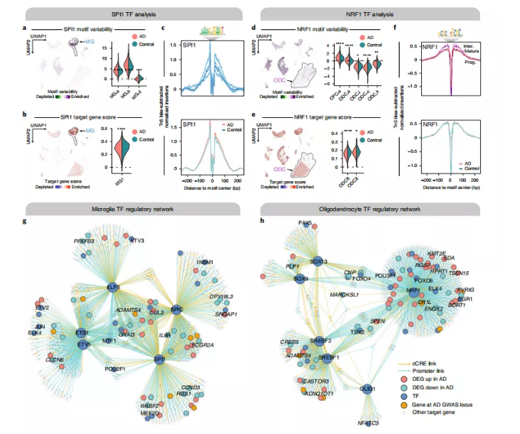為了進(jìn)一步探究晚期AD中TF介導(dǎo)的基因調(diào)控,研究人員構(gòu)建了特定細(xì)胞類型的TF調(diào)控網(wǎng)絡(luò)。對于特定的TF,研究人員確定了候選目標(biāo)基因,即其啟動子或連鎖的cCRE是可訪問的,并且在目標(biāo)細(xì)胞類型中包含TF的結(jié)合基序的基因,研究人員對幾個(gè)選定的TF重復(fù)了這一過程,產(chǎn)生了小膠質(zhì)細(xì)胞特異性和少突膠質(zhì)細(xì)胞特異性的TF調(diào)控網(wǎng)絡(luò)(圖4g,h)。在這些網(wǎng)絡(luò)中,研究人員發(fā)現(xiàn)了多個(gè)AD DEGs,除了位于已知AD GWAS位點(diǎn)的基因外,還受到小膠質(zhì)細(xì)胞中的SPI1和少突膠質(zhì)細(xì)胞中的NRF1的調(diào)控。