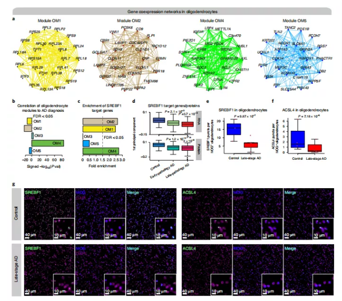 此外,研究人員在共表達(dá)網(wǎng)絡(luò)中檢查了SREBF1的下游調(diào)控靶基因。隨后又發(fā)現(xiàn)其中三個(gè)少突膠質(zhì)細(xì)胞顯著富集了SREBF1的靶基因,這表明SREBF1在調(diào)節(jié)這些模塊中的基因表達(dá)方面發(fā)揮重要作用(圖8c)。將批量RNA-seq、高通量蛋白質(zhì)組學(xué)、SREBF1-ChIP)以及ChIP-seq的數(shù)據(jù)確定了SREBF1靶基因的蛋白-蛋白相互作用(PPI)網(wǎng)絡(luò)。此外,研究人員發(fā)現(xiàn)SREBF1靶基因模塊的基因表達(dá)量在AD早期和晚期樣本的蛋白和RNA中下調(diào)(圖8d),證實(shí)snATAC-seq SREBF1基序的可變性。通過RNA原位雜交和免疫組織化學(xué)方法驗(yàn)證了SREBF1在晚期AD中的下調(diào),并發(fā)現(xiàn)ACSL4的表達(dá)在晚期AD中有所降低,ACSL4是ENCODE Chip-Seq數(shù)據(jù)中發(fā)現(xiàn)的SREBF1的靶點(diǎn)之一 (圖8e-g)??傮w而言,研究人員的共表達(dá)網(wǎng)絡(luò)分析方法有助于識別細(xì)胞類型特異性疾病,在少突膠質(zhì)細(xì)胞中發(fā)現(xiàn)了TF SREBF1,這在AD中基本上沒有研究過,表明其研究方法能夠?qū)膊‘a(chǎn)生新的見解。