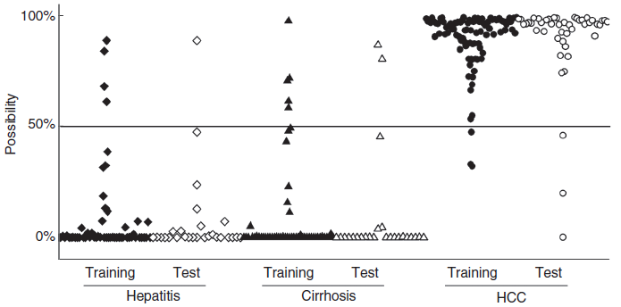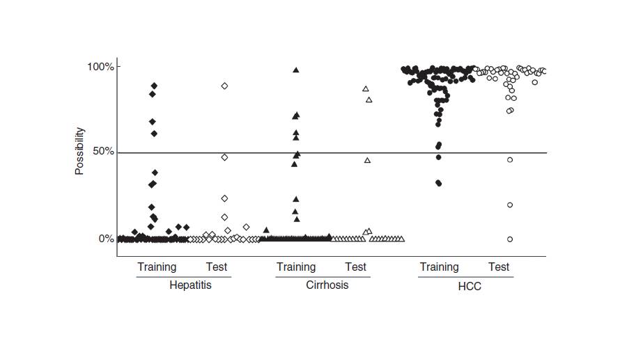 為了評(píng)價(jià)和驗(yàn)證篩選出的差異物是否具有良好的診斷能力,進(jìn)行內(nèi)部驗(yàn)證,即將發(fā)現(xiàn)隊(duì)列的298例樣本中的一部分樣本作為訓(xùn)練集(training set)用來(lái)構(gòu)建診斷模型,剩余的樣本作為測(cè)試集(test set)用來(lái)測(cè)試篩選出的標(biāo)志物的診斷能力。結(jié)果如圖所示:在訓(xùn)練集中,模型對(duì)慢性肝病和肝癌診斷的準(zhǔn)確性分別達(dá)到91.6%和96.8%,表明模型建立良好。在測(cè)試集中,模型對(duì)慢性肝病和肝癌診斷的準(zhǔn)確性分別達(dá)到94.2%和93.5%,表明篩選到的標(biāo)志物診斷能力良好。