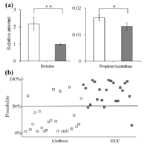 甜菜堿、丙酰肉堿組合能夠?qū)Ω闻K疾病進(jìn)行良好的預(yù)測(cè),可以作為臨床肝癌的診斷標(biāo)志物甲胎蛋白AFP的補(bǔ)充診斷手段。