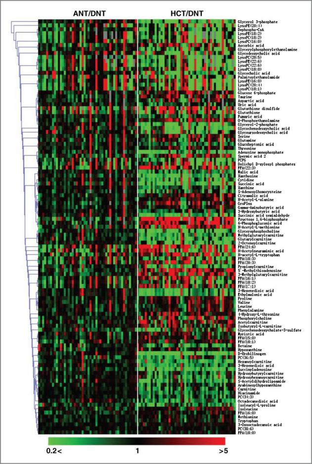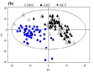 利用非靶向代謝組學(xué)技術(shù)對(duì)50例肝癌患者的癌組織(HCT)與近端癌旁組織(ANT)以及遠(yuǎn)端癌旁組織(DNT)組織樣本中的代謝物進(jìn)行LC-MS檢測(cè)分析,通過(guò)多元變量統(tǒng)計(jì)分析發(fā)現(xiàn)癌組織與近端以及遠(yuǎn)端癌旁組織樣本之間區(qū)分明顯(圖1),即癌組織與近端以及遠(yuǎn)端癌旁組織的代謝表型差異顯著。