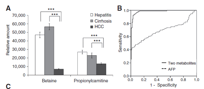 為了更一步分析癌組織與癌旁組織篩選到的差異物是否具有作為臨床診斷的潛力,對(duì)血液樣本進(jìn)行非靶代謝組學(xué)分析,尋找在組織和血液中共有的在組織樣本差異表達(dá)的代謝物。從血液和組織樣本的共同差異代謝物中初篩標(biāo)志物。為了從差異物中找到可以與AFP互補(bǔ)的標(biāo)志物,與常用的肝癌診斷標(biāo)志物甲胎蛋白(AFP)進(jìn)行相關(guān)性分析,在差異物與血漿中的AFP進(jìn)行皮爾森相關(guān)性分析(Pearson correlation analysis),找到了8個(gè)與AFP不相關(guān)的差異物。8個(gè)候選的診斷標(biāo)志物中進(jìn)一步通過(guò)篩選到了2個(gè)候選診斷標(biāo)志物(甜菜堿、丙酰肉堿)。如下圖所示,這兩個(gè)標(biāo)志物在肝癌患者中的相對(duì)表達(dá)量顯著下調(diào),組合在一起能夠?qū)Ω伟┖吐愿尾。?98例樣本)能夠進(jìn)行良好的區(qū)分( ROC AUC=0.982),明顯優(yōu)于甲氧蛋白AFP的診斷能力(ROC AUC=0.697)。