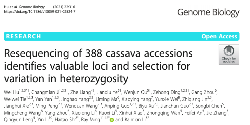 [1] Hu W, Ji C, Liang Z, et al. Resequencing of 388 cassava accessions identifies valuable loci and selection for variation in heterozygosity. Genome Biol. 2021 Nov 16;22(1):316.