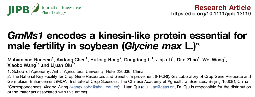 [3] Nadeem M, Chen A, Hong H, et al. GmMs1 encodes a kinesin-like protein essential for male fertility in soybean (Glycine max L.). J Integr Plant Biol. 2021 Jun;63(6):1054-1064.