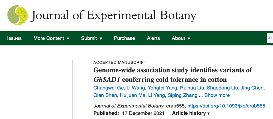 [4] Ge C, Wang L, Yang Y, et al. Genome-wide association study identifies variants of GhSAD1 conferring cold tolerance in cotton. J Exp Bot. 2021 Dec 17:erab555.