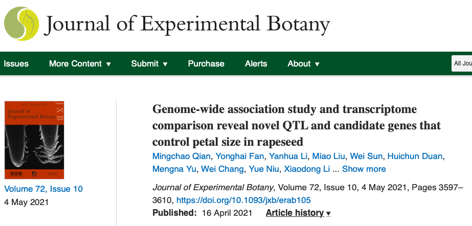 [5] Qian M, Fan Y, Li Y, et al. Genome-wide association study and transcriptome comparison reveal novel QTL and candidate genes that control petal size in rapeseed. J Exp Bot. 2021 May 4;72(10):3597-3610.