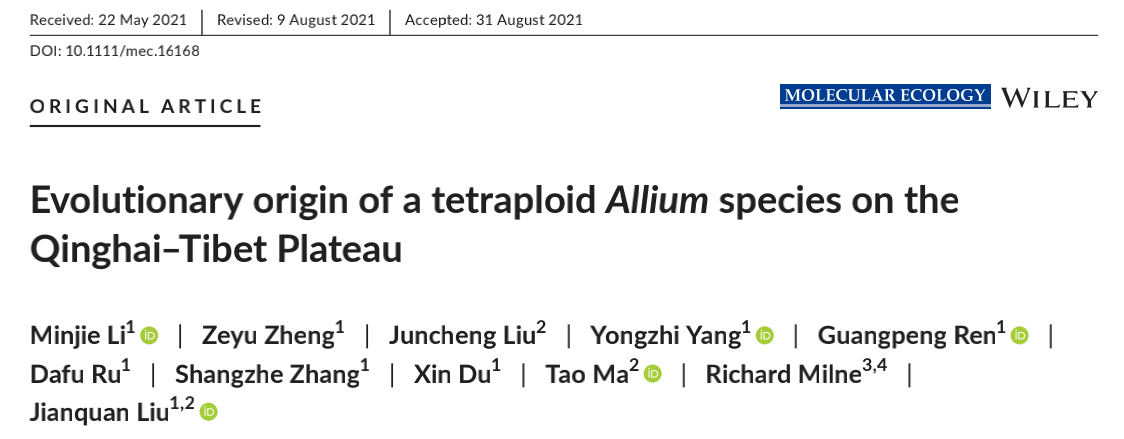 [7] Li M, Zheng Z, Liu J, et al. Evolutionary origin of a tetraploid Allium species on the Qinghai-Tibet Plateau. Mol Ecol. 2021 Nov;30(22):5780-5795.