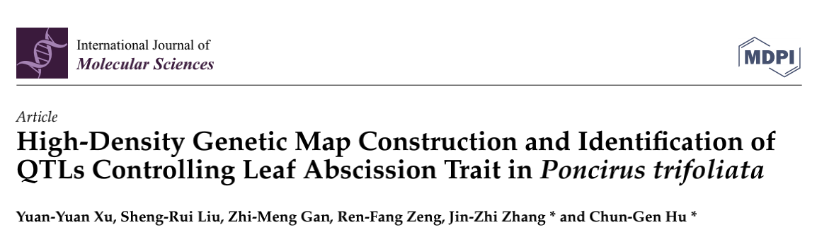 [8] Xu YY, Liu SR, Gan ZM, et al. High-Density Genetic Map Construction and Identification of QTLs Controlling Leaf Abscission Trait in Poncirus trifoliata. Int J Mol Sci. 2021 May 27;22(11):5723.