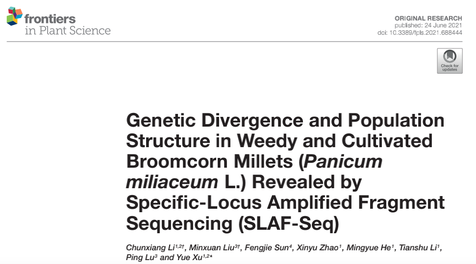 [9] Li C, Liu M, Sun F, et al. Genetic Divergence and Population Structure in Weedy and Cultivated Broomcorn Millets (Panicum miliaceum L.) Revealed by Specific-Locus Amplified Fragment Sequencing (SLAF-Seq). Front Plant Sci. 2021 Jun 24;12:688444.