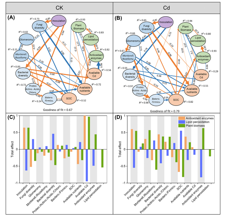 與細(xì)菌群落相反,VPA顯示真菌群落對(duì)土壤變量的影響較小(圖4A和B),這與我們的結(jié)果一致,即除Olsen-P和pH值外,真菌群落與根際中的SOC和養(yǎng)分沒(méi)有很強(qiáng)的相關(guān)性(圖4C)。我們的結(jié)果表明,真菌群落在提高紫花苜??笴d脅迫方面的相關(guān)效果低于細(xì)菌群落。這些結(jié)果也被發(fā)現(xiàn)的關(guān)鍵真菌類群和根際變量之間的微弱相關(guān)性所支持(圖4E)。但是,由AMF接種引起的這些關(guān)鍵真菌類群的變化強(qiáng)烈影響了關(guān)鍵細(xì)菌類群,這表明這些關(guān)鍵真菌類群可能通過(guò)影響細(xì)菌群落的方式在Cd脅迫下輔助苜蓿生長(zhǎng)中發(fā)揮間接作用。這些結(jié)果也闡明了根瘤菌和AMF共同接種與單獨(dú)接種相比促進(jìn)苜??剐院蜕L(zhǎng)的原因。通過(guò)PLS-PM分析(圖5),關(guān)鍵的真菌類群對(duì)關(guān)鍵的細(xì)菌類群有直接影響,這對(duì)植物的抗性和生長(zhǎng)有間接的有利影響。一般來(lái)說(shuō),在根瘤菌和AMF共同接種處理下,根瘤菌群落而非相應(yīng)的真菌群落主要提高了紫花苜蓿對(duì)Cd脅迫的抗性。