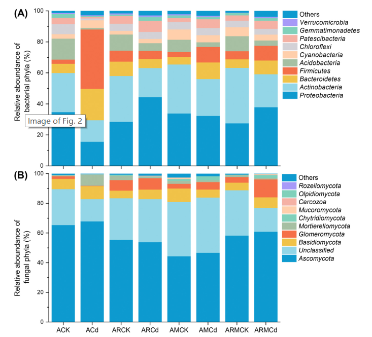 我們的研究在所有不同的處理中檢測(cè)到了10個(gè)細(xì)菌門類(相對(duì)豐度>1%),即變形菌門(Proteobacteria)、放線菌門(Actinobacteria)、擬桿菌門(Bacteroidetes)、厚壁菌門(Firmicutes)、酸桿菌門(Acidobacteria)、藍(lán)藻細(xì)菌門(Cyanobacteria)、綠彎菌門(Chloroflexi)、髕骨細(xì)菌門(Patescibacteria)、芽單胞菌門(Gemmatimonadetes)和疣微菌門(Verrucomicrobia) (圖2A)。相對(duì)豐度<1%的其他種群被歸為”Others”。在所有處理中,Bacteroidetes、Actinobacteria、Proteobacteria和Firmicutes是主要的細(xì)菌門。Cd添加、接種及其相互作用顯著影響了Firmicutes、Bacteroidetes和Acidobacteria的相對(duì)豐度。特別是Cd的添加,明顯降低了所有接種(AR、AM和ARM)處理中Actinobacteria的相對(duì)豐度,而增加了兩個(gè)接種(AM和ARM)處理中Firmicutes的相對(duì)豐度。