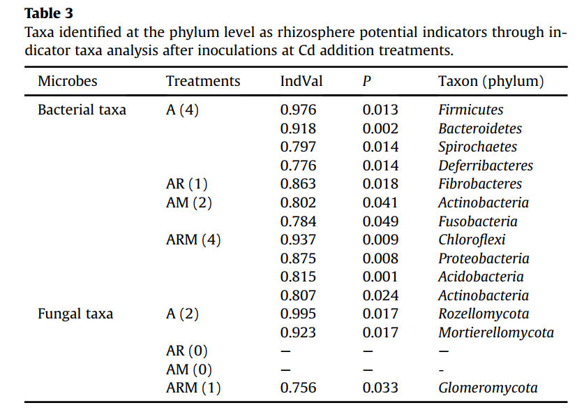 表3 通過(guò)添加Cd處理后的指示性類群分析,在門類水平將分類群確定為根際潛在指標(biāo)。