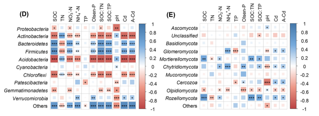 VPA的結(jié)果表明,土壤性質(zhì)和Cd含量一般能解釋細(xì)菌群落的大部分變化(62.8%),而它們只能解釋真菌群落12.9%的變化(圖4A和B)。Mantel檢驗(yàn)和相關(guān)分析表明,除TP和SOC:TP外,其他土壤變量均與細(xì)菌群落顯著相關(guān),而只有Olsen-P和pH值對(duì)真菌群落有顯著影響(圖4C)。此外,RDA還證實(shí),與不同處理的真菌群落相比,土壤變量對(duì)不同處理的細(xì)菌群落有更明顯的影響。根據(jù)相關(guān)性熱圖和RDA或CCA,細(xì)菌群落中的Actinobacteria、Bacteroidetes、Firmicutes、Acidobacteria和Chloroflexi與除TP外的其他土壤變量顯著相關(guān)(P<0.05;圖4D)。然而,在真菌群落中,只有Chytridiomycota、Olpidiomycota和Rozellomycota與大多數(shù)土壤變量表現(xiàn)出明顯的相關(guān)性(P <0.05;圖4E)。