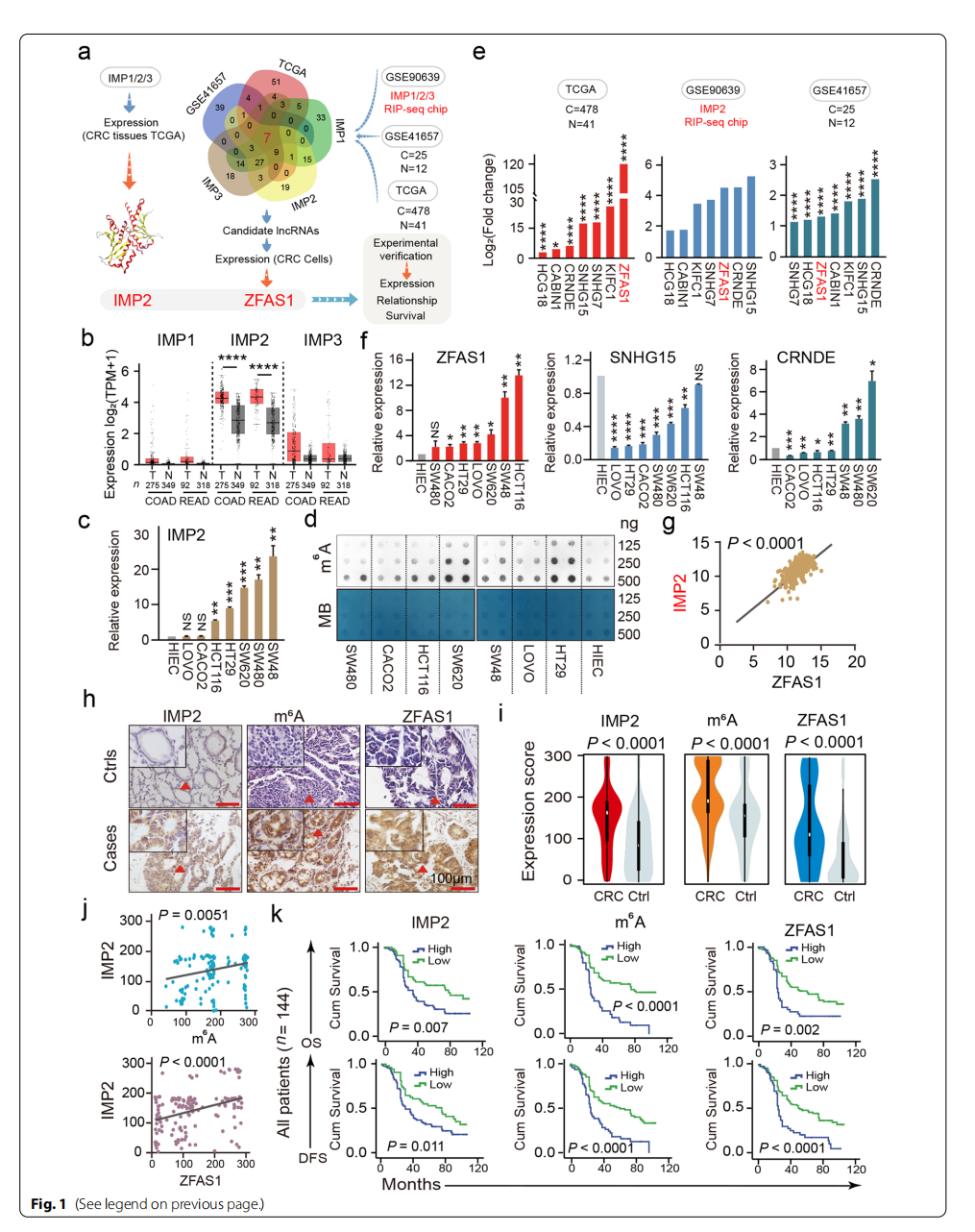 為了研究IMP2在ZFAS1表達中的潛在作用及其相關(guān)的m6A甲基化水平,本文進行了組織微陣列(TMA)、RNA原位雜交(ISH)和免疫組化(IHC)檢測,分析CRC組織樣本和對應(yīng)的癌旁組織(n=144)中IMP、m6A和ZFAS1的表達(圖1h)。值得注意的是,在CRC組織中,IMP2、ZFAS1的表達和m6A的甲基化水平急劇增加(圖1i)。進一步進行相關(guān)模式分析,表明IMP2和ZFAS1的表達和m6A水平呈現(xiàn)正相關(guān)性(圖1j)。