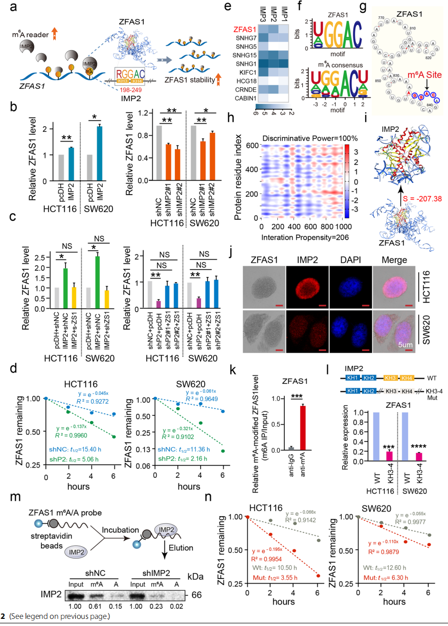 2、CRC細胞中IMP2通過直接與ZFAS1的m6A位點結(jié)合促進ZFAS1的穩(wěn)定性