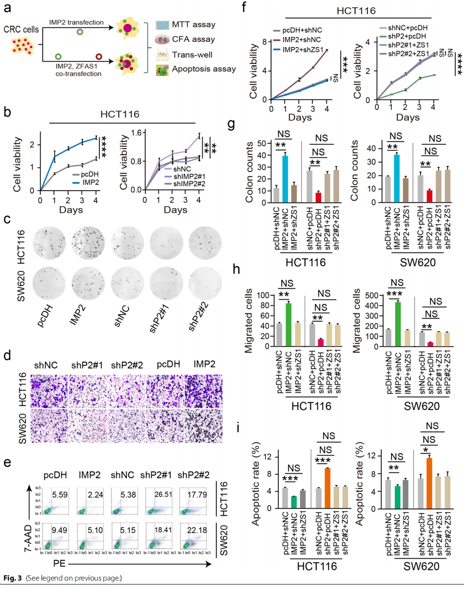 為了進一步明確在CRC細胞中IMP2和ZFAS1特異性的調(diào)控模式,首先通過MTT實驗(圖3b)和細胞克隆實驗(CFA)(圖3c)分析了干擾IMP2表達后的HCT116和SW620細胞系的細胞增殖能力和細胞克隆能力。結(jié)果發(fā)現(xiàn)異位IMP2的表達顯著促進了CRC細胞的生長和克隆能力,而IMP2的耗竭抑制了CRC細胞的增殖。此外還檢測了細胞侵襲能力(圖3d),發(fā)現(xiàn)在沉默IMP2時,細胞的遷移受到了明顯的抑制,而IMP2的過表達極大地提高了HCT116和SW620細胞系的侵襲能力。還發(fā)現(xiàn)IMP2的敲除增加了CRC細胞的凋亡率,IMP2的過表達會抑制CRC細胞的凋亡率(圖3e)。后續(xù)通過拯救實驗表明ZFAS1的過表達逆轉(zhuǎn)了對CRC細胞的促進作用,包括細胞增殖能力、細胞克隆能力、細胞遷移能力和細胞凋亡率(圖3f-i)。