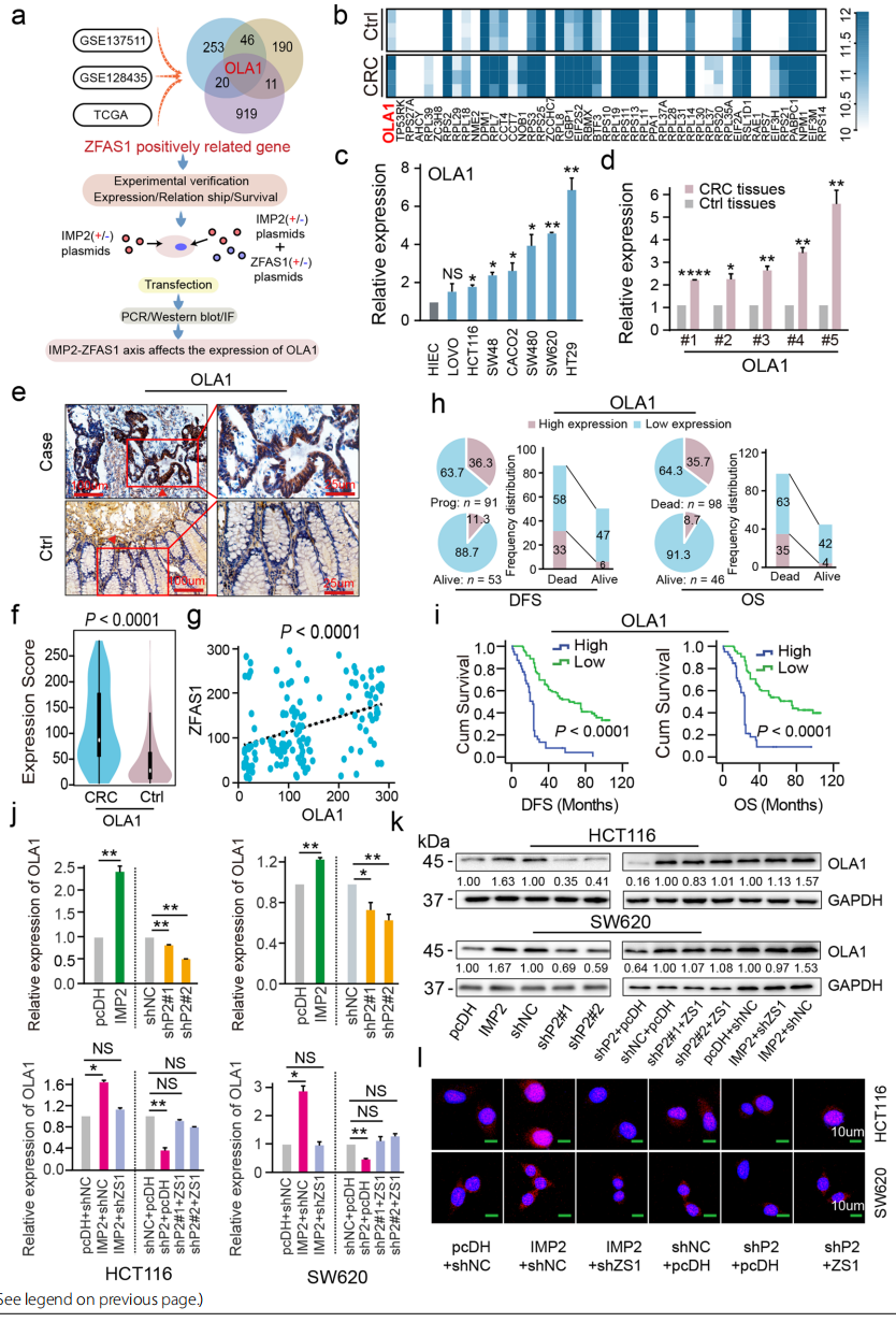 隨后采用TMA和IHC檢測OLA1的表達(圖4e),通過RCO曲線評估OLA1的低/高表達,發(fā)現(xiàn)與對照組相比,CRC組織中觀察到明顯的OLA1表達,表現(xiàn)出致癌基因的特性(圖4e,f)。且OLA1與ZFAS1的表達存在正相關(guān)性(圖4g)。與臨床數(shù)據(jù)做相關(guān)性分析,結(jié)果表明OLA1低表達的患者占比較高(圖4h),OLA1高表達的CRC患者的DFS和OS時間明顯縮短了(圖4i)。后續(xù)針對OLA1是否是ZFAS1的下游靶點做驗證,IMP2沉默/過表達不僅降低/增加了OLA1 mRNA的表達,而且降低/增加了OLA1蛋白的表達。但是IMP2對OLA1的影響可以被ZFAS2完全逆轉(zhuǎn)(圖4j-l)。