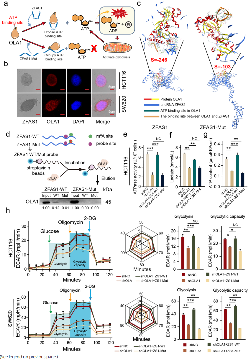 接下來探索OLA1的ATP酶活性的變化對CRC細胞能量代謝的影響,研究了HCT116和SW620細胞系中乳酸和ATP的含量。發(fā)現(xiàn)OLA1表達的減少不僅可以降低乳酸的積累,還可以減少細胞中ATP的含量(圖5f,g)。通過細胞外酸化率的測定檢測OLA1的變化對CRC細胞的糖酵解代謝能力的影響,發(fā)現(xiàn)OLA1表達的減少可以顯著降低CRC細胞的糖酵解代謝能力,ZFAS1-WT可以恢復(fù)OLA1表達減少對CRC細胞糖酵解代謝能力的影響(圖5h)。