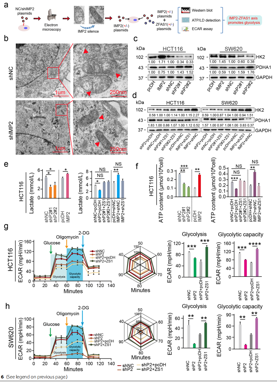 IMP2的過度表達明顯增強了乳酸和ATP的釋放,還發(fā)現(xiàn)IMP2敲除導(dǎo)致乳酸和ATP含量的釋放大幅度減少,而ZFAS1可以完全逆轉(zhuǎn)IMP2的影響(圖6e,f)。細胞能量代謝檢測進一步表明IMP2沉默減弱了細胞的糖酵解代謝能力,而ZFAS1可以逆轉(zhuǎn)IMP2沉默對糖酵解水平降低的影響(圖6g,h)。