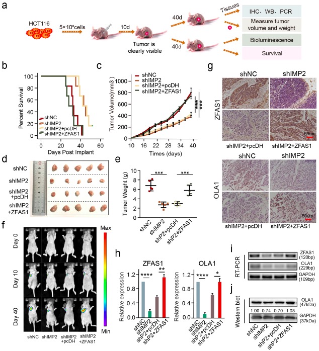 利用異體移植模型驗證IMP2-ZFAS1-OLA1信號軸在體內(nèi)的生物學(xué)功能(圖7a),預(yù)后評估顯示異種移植小鼠在與shIMP2和ZFAS1載體共同轉(zhuǎn)染后,生存時間明顯縮短(圖7b),表明IMP2和ZFAS1在CRC預(yù)后評估中具有協(xié)同作用。此外,轉(zhuǎn)染shIMP2載體的異種移植小鼠中,腫瘤體積、大小和重量都明顯減少;然而,在與shIMP2和ZFAS1載體共同轉(zhuǎn)染后,腫瘤體積、大小和重量急劇增加(圖7c-e)。實驗結(jié)果說明在異種移植模型中,ZFAS1的過表達明顯地逆轉(zhuǎn)了IMP2沉默對腫瘤生長的抑制作用(圖7f)。