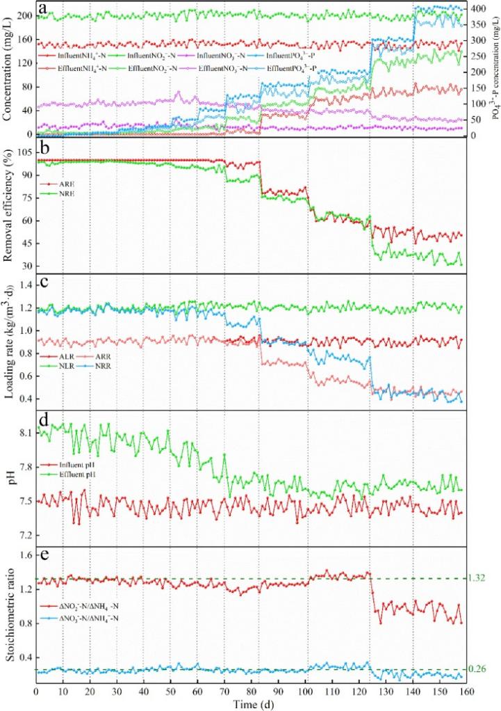圖2. 不同磷酸鹽劑量下MAB在158 d內(nèi)的脫氮性能:(a)底物濃度;(b)去除效率;(c)裝載率;(d) pH值變化;(e)化學(xué)計量比