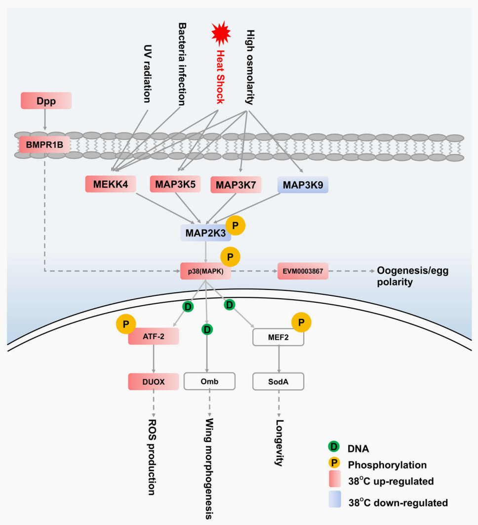 作者進(jìn)一步結(jié)合不同逆境條件處理下的轉(zhuǎn)錄組數(shù)據(jù),分析推測出橘小實蠅中熱休克蛋白的相對穩(wěn)定高表達(dá)是其快速適應(yīng)逆境的內(nèi)在機制。并發(fā)現(xiàn)在高溫條件下,p38 MAPK通路關(guān)鍵基因表現(xiàn)為應(yīng)激性高表達(dá),表明p38MAPK信號通路在橘小實蠅快速適應(yīng)新環(huán)境的過程中發(fā)揮重要作用,并且可能是橘小實蠅在非生物脅迫下維持穩(wěn)態(tài)機制的核心。