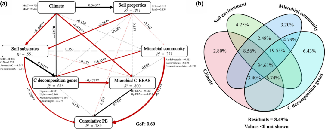 圖1 環(huán)境活力對(duì)累積啟動(dòng)效應(yīng) (PE) 的影響 (a) PLS-PM有向圖 (b) VPA分析顯示氣候、土壤環(huán)境、微生物群落和C分解基因?qū)鄯e啟動(dòng)效應(yīng)的相對(duì)貢獻(xiàn)
