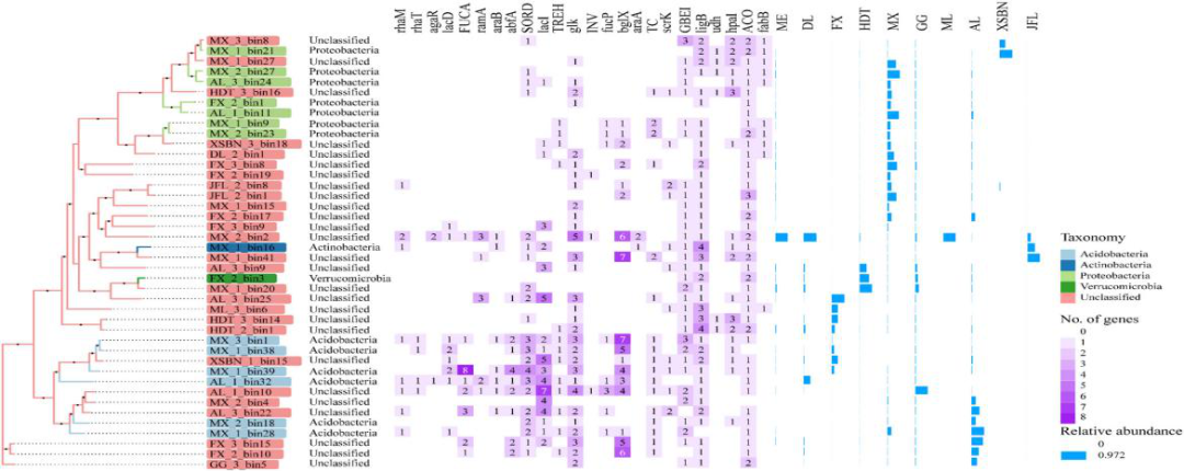 對(duì)于分類學(xué),42個(gè)MAG在門水平上代表了變形菌門(七個(gè))、酸桿菌門(六個(gè))、放線菌門(一個(gè))和疣微菌門(一個(gè))中的多種細(xì)菌門。在變形菌門中,Alphaproteobacteria綱(四個(gè))和Rhizobiales目(兩個(gè))是最豐富的。在酸桿菌中,Solibacteres綱(四個(gè))和?Candidatus Solibacter usitatus?種(四個(gè))代表更多。此外,基于系統(tǒng)發(fā)育關(guān)系,來自16S rRNA 系統(tǒng)型的五個(gè)未分類bin與相似的分類bin聚類。