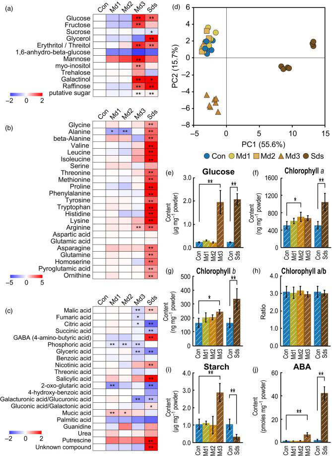 研究結(jié)果:為了分析植物對不同干旱脅迫響應的分子機制,作者開發(fā)了一種基于土壤基質(zhì)電位(SMP)的灌溉系統(tǒng),可√準控制土壤水分。使用該系統(tǒng),水稻幼苗在三種不同的干旱水平下生長,分別表示為?Md1、Md2?和?Md3,SMP?值分別設(shè)置為?-9.8、-31.0?和?-309.9?kPa。Md1?處理沒有明顯的表型變化,?Md2?處理導致氣孔關(guān)閉和枝條生長遲緩?(SGR)。Md3?處理出現(xiàn)明顯的SGR,但是不抑制光合作用。更嚴重的干旱?(Sds)?處理,在這種情況下終止灌溉,導致葉片枯萎和光合作用受到抑制。代謝組分析發(fā)現(xiàn)?Md3?和?Sds?下干旱會導致糖類和氨基酸含量的增加。淀粉含量在?Md3?下增加,在?Sds?下減少。轉(zhuǎn)錄組數(shù)據(jù)顯示,上述代謝物的含量是受到相關(guān)基因在轉(zhuǎn)錄水平上調(diào)控的。為了進一步了解觀察到?SGR,在特定組織中進行了轉(zhuǎn)錄組和激素分析。結(jié)果顯示在?Md2、Md3?和?Sds?處理的芽基中吲哚-3-乙酸?(IAA)?和細胞分裂素水平的特異性降低,但是激素代謝相關(guān)基因的表達水平并沒有變化。這些觀察結(jié)果表明,干旱可能是影響細胞分裂素和生長素在特定組織中的分配和降解。