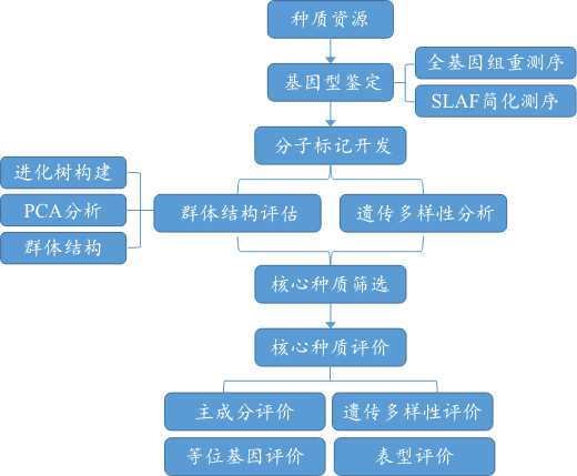 核心種質(zhì)可以最大限度地去除原始種質(zhì)資源中的重復,以最少的種質(zhì)材料代表原始種質(zhì)資源的全部或大多數(shù)遺傳多樣性和地理來源,為當前越來越多的種質(zhì)資源收集、評價和利用帶來了便利,特別是隨著基因組學的發(fā)展,測序成本的極速下降,使得大規(guī)模群體測序得以實現(xiàn)。利用高分辨率的分子標記,提升遺傳材料間遺傳相似度和雜合度的鑒別能力,從而選擇能夠代表整個種質(zhì)資源基因多樣性的大小合理的核心種質(zhì)材料,更加有助于種質(zhì)資源的保存、管理、使用。使得我們可以有重點地進行優(yōu)異種質(zhì)的研究,結合GWAS分析、遺傳進化分析、QTL定位、特有標記開發(fā)等方法進一步進行基因的挖掘與克隆,提高種質(zhì)資源的利用效率。