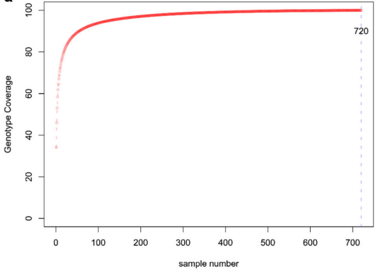 1984年,F(xiàn)rankel等人首次提出了核心種質(zhì)(core?collection)的概念。近幾十年來,核心種質(zhì)發(fā)展迅速,已在多種植物上建立核心種質(zhì),特別是近幾年分子標記和測序技術的廣泛應用使得基于高密度SNP標記構建核心種質(zhì)成為可能,對種質(zhì)資源的群體結構和遺傳多樣性研究也愈加深入。如(Girma?et?al.,?2020)等用879,407個SNP對2010份埃塞俄比亞高粱種質(zhì)資源進行核心種質(zhì)資源鑒定,選擇了387個(種質(zhì)資源的20%)種質(zhì)作為核心種質(zhì);(Kumar?et?al.,?2020)等用3,565,117個高質(zhì)量SNP對3004份水稻進行核心種質(zhì)鑒定,得到一個包含520個種質(zhì)的微核心種質(zhì),結果表明其代表了原有樣品的所有表型和地理來源;(Milner?et?al.,?2019)等對22,621份庫存大麥種質(zhì)資源基因組多樣性進行研究,共選出1000份作為其核心種質(zhì)集。除此之外,還有芝麻、小麥、棉花、甘薯、葡萄、杏、黃瓜、茄子、杉木、馬尾松等多種植物成功構建了核心種質(zhì)資源庫。