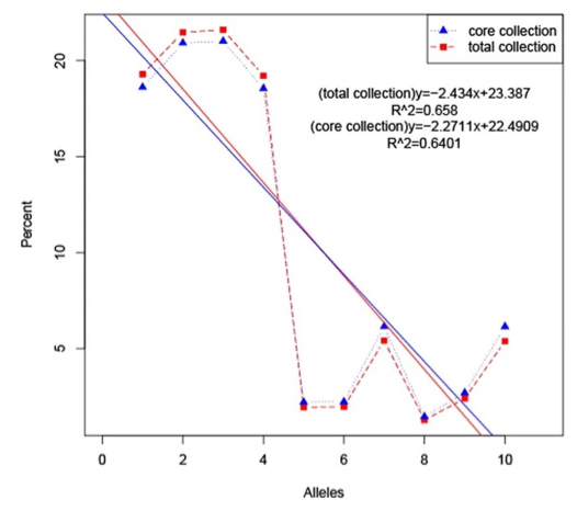 構建好的核心種質(zhì)采用何種方法去評估核心樣品對整個種質(zhì)資源多樣性的代表性同樣是核心種質(zhì)研究中的重點。目前,大多數(shù)研究者結合不同的方法對核心種質(zhì)進行評估驗證,通過對原始種質(zhì)材料和篩選的核心種質(zhì)材料進行主成分分析,評估種質(zhì)篩選的準確性,原則上,基于核心種質(zhì)繪制的主成分圖和所有材料的分布圖趨勢吻合,就能說明篩選結果的合理性;計算常規(guī)的遺傳多樣性指標:觀測雜合度(Observed?heterozygosity)、期望雜合度(Expected?heterozygosity)、Nei遺傳多樣性(Nei?diversity?index)、香濃維納多樣性指數(shù)(Shanon-Wiener?index)、多態(tài)性信息含量(PIC),對原始種質(zhì)材料以及篩選的核心種質(zhì)的遺傳多樣性進行評價;另外還包括等位基因評價和表型評價。