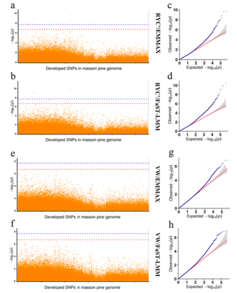主要內(nèi)容:在本研究中,采用SLAF-seq技術對從中國廣東收集的149份馬尾松(Pinus?massoniana)材料進行測序,從599,164個多態(tài)性SLAF標簽中鑒定了471,660個SNP標記。群體結構分析表明,149份馬尾松不能劃分成明顯的亞種群。使用遺傳距離和種群結構來選擇核心種質(zhì),篩選出包含29個材料的核心種質(zhì),分別與樹脂產(chǎn)量和木材體積相關。對122份馬尾松材料進行關聯(lián)分析,包括不同高度(HT)、胸徑(DBH)、樹脂質(zhì)量(RW)、木材體積(VW)和樹脂產(chǎn)率(RYC),使用mrMLM、FASTmrMLM、FASTmrEMMA和ISIS?EM-BLASSO檢測到大量的SNP與性狀HT、DBH、RW和RYC顯著相關。馬尾松核心種質(zhì)為未來的改良育種提供寶貴的資源。
