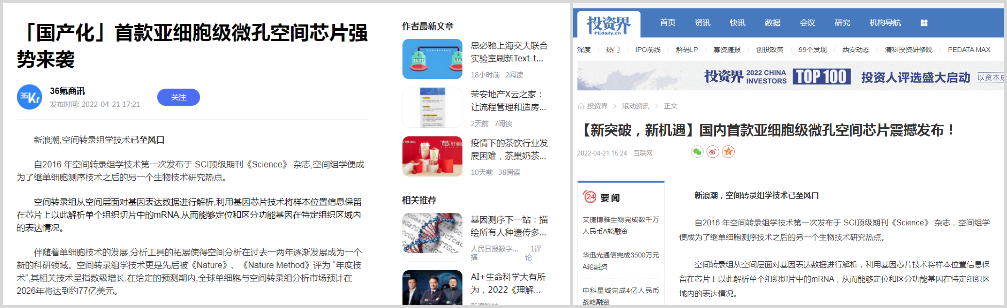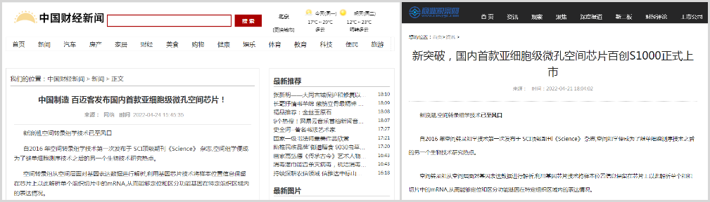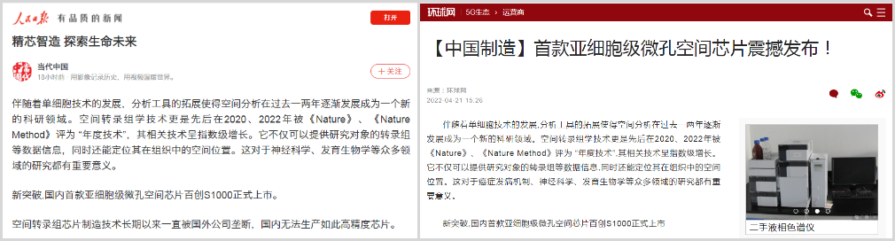 4月20日,百邁客生物在北京發(fā)布了亞細(xì)胞級微孔空間組學(xué)芯片“百創(chuàng)S1000”,該芯片可以讓研究者們可以結(jié)合不同階段圖譜數(shù)據(jù),獲得全面的亞細(xì)胞級時(shí)空動(dòng)態(tài)表達(dá)圖譜,從而為疾病的診斷治療及藥物研發(fā)提供更有力的決策依據(jù),相比目前國外空間轉(zhuǎn)錄組測序芯片精度提高了近400倍,同時(shí)還能拍攝高清HE染色圖片!