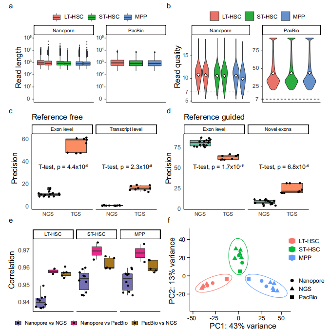 為了評(píng)估重復(fù)之間的一致性,計(jì)算了短讀長(zhǎng)和長(zhǎng)讀長(zhǎng)測(cè)序之間的基因定量的相關(guān)性。相關(guān)系數(shù)均在0.93以上(圖4e),表明重復(fù)樣本間具有較高的一致性。此外,PCA顯示短讀長(zhǎng)和長(zhǎng)讀長(zhǎng)測(cè)序數(shù)據(jù)按細(xì)胞類型進(jìn)行了聚類(圖4f)。結(jié)果表明,長(zhǎng)讀長(zhǎng)測(cè)序數(shù)據(jù)質(zhì)量高,生物重復(fù)一致性高。此外,長(zhǎng)讀長(zhǎng)測(cè)序能夠?qū)π碌耐怙@子和轉(zhuǎn)錄本進(jìn)行識(shí)別和定量。