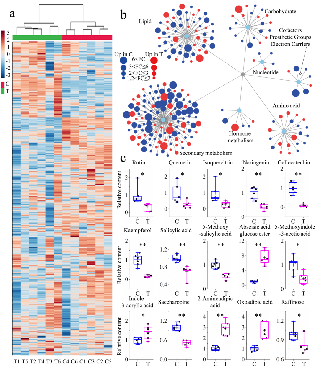 圖2四環(huán)素改變了代謝組,特別是次生代謝和脂質(zhì)代謝。a、代謝物的熱圖譜聚類,顯示代謝物的相對含量。b、差異代謝物根據(jù)其功能/通路的綜合性進行聚類。?圓的大小與折疊變化(FC)值成正比。?紅色表示在四環(huán)素中有更高的FC?(T),而藍色表示在對照中有更高的FC?(C)。c、受四環(huán)素影響的代謝途徑相關代謝物的箱式圖。?*在P?<?0.05時差異顯著,**在P?<?0.01時差異顯著。