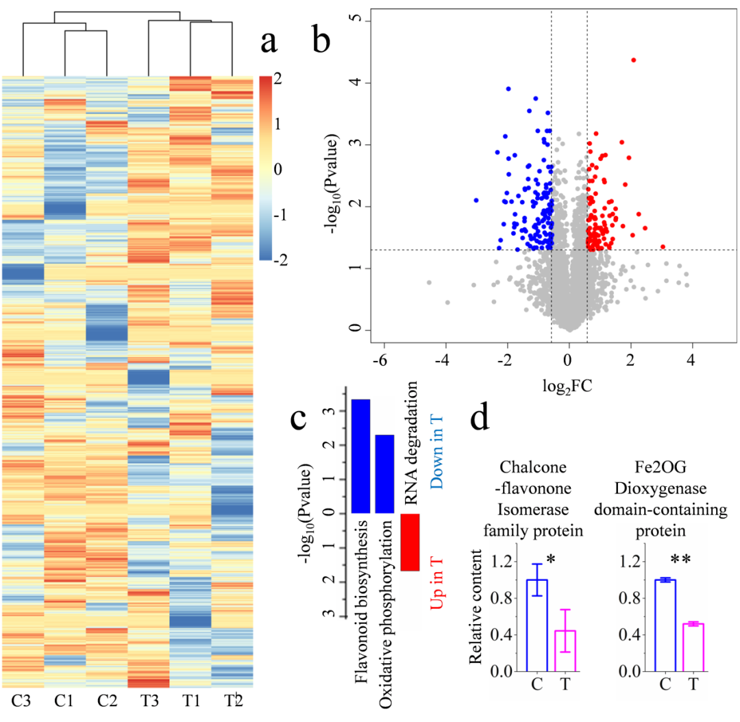 與對照組相比,在四環(huán)素處理下有273種蛋白質(zhì)發(fā)生了顯著變化(P<?0.05)。KEGG富集分析發(fā)現(xiàn),這些差異蛋白與類黃酮生物合成、氧化磷酸化、RNA降解、植物晝夜節(jié)律和α?-亞麻酸代謝相關。最顯著的是,在四環(huán)素脅迫下,與RNA降解相關的蛋白顯著增加(P?<?0.05,增加80%以上)。黃酮類化合物的生物合成和氧化磷酸化顯著減少(P?<?0.05,下降80%以上)。與轉(zhuǎn)錄組結(jié)果一致,黃酮類化合物的生物合成通路也是顯著降低。