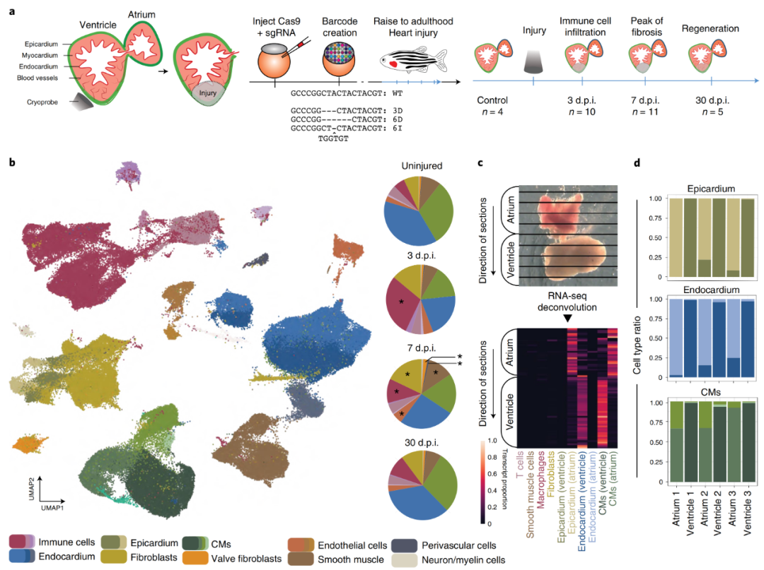 為了系統(tǒng)地識別健康和再生斑馬魚心臟中的細(xì)胞類型,作者對損傷前后不同階段的大約20萬個(gè)解離細(xì)胞進(jìn)行了scRNA-seq(圖1a)。為了準(zhǔn)確得到細(xì)胞發(fā)育起源的相關(guān)信息,作者還應(yīng)用了一種基于CRISPR–Cas9技術(shù)的大規(guī)模平行譜系追蹤方法,通過注射Cas9和針對多拷貝轉(zhuǎn)基因(斑馬魚系中的dTomato:一種用于斑馬魚細(xì)胞追蹤和譜系分析的多光譜細(xì)胞標(biāo)記)的sgRNA,創(chuàng)建了作為譜系條形碼的“遺傳疤痕”來記錄早期發(fā)育中的譜系關(guān)系。