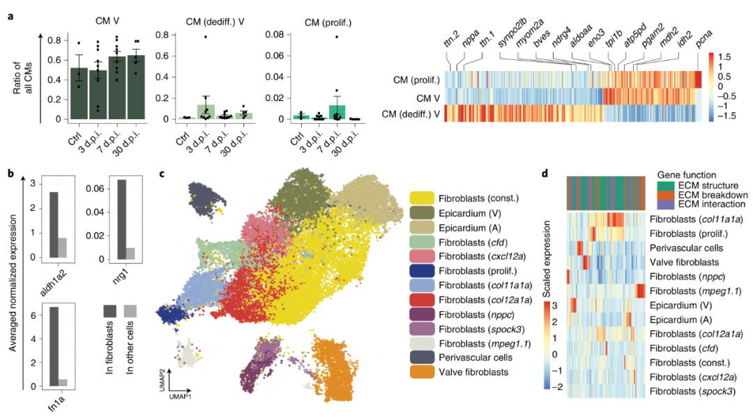 作者注意到心臟再生中三個(gè)成熟的信號因子在成纖維細(xì)胞中高度富集:合成視黃酸的酶aldh1a2、心肌細(xì)胞有絲分裂原nrg1和再生細(xì)胞外基質(zhì)(ECM)因子fn1a(圖2b)。為了更詳細(xì)地研究心臟成纖維細(xì)胞的多樣性,作者對成纖維細(xì)胞進(jìn)行了亞群聚類。結(jié)果顯示出驚人的多樣性,有13個(gè)轉(zhuǎn)錄上不同的成纖維細(xì)胞聚類(圖2c)。這13個(gè)基因簇在ECM相關(guān)基因的表達(dá)譜上表現(xiàn)出明顯的差異(圖2d),但它們的轉(zhuǎn)錄組多樣性遠(yuǎn)不止于此——去除ECM相關(guān)基因后,可以高精度鑒定相同的成纖維細(xì)胞亞型。