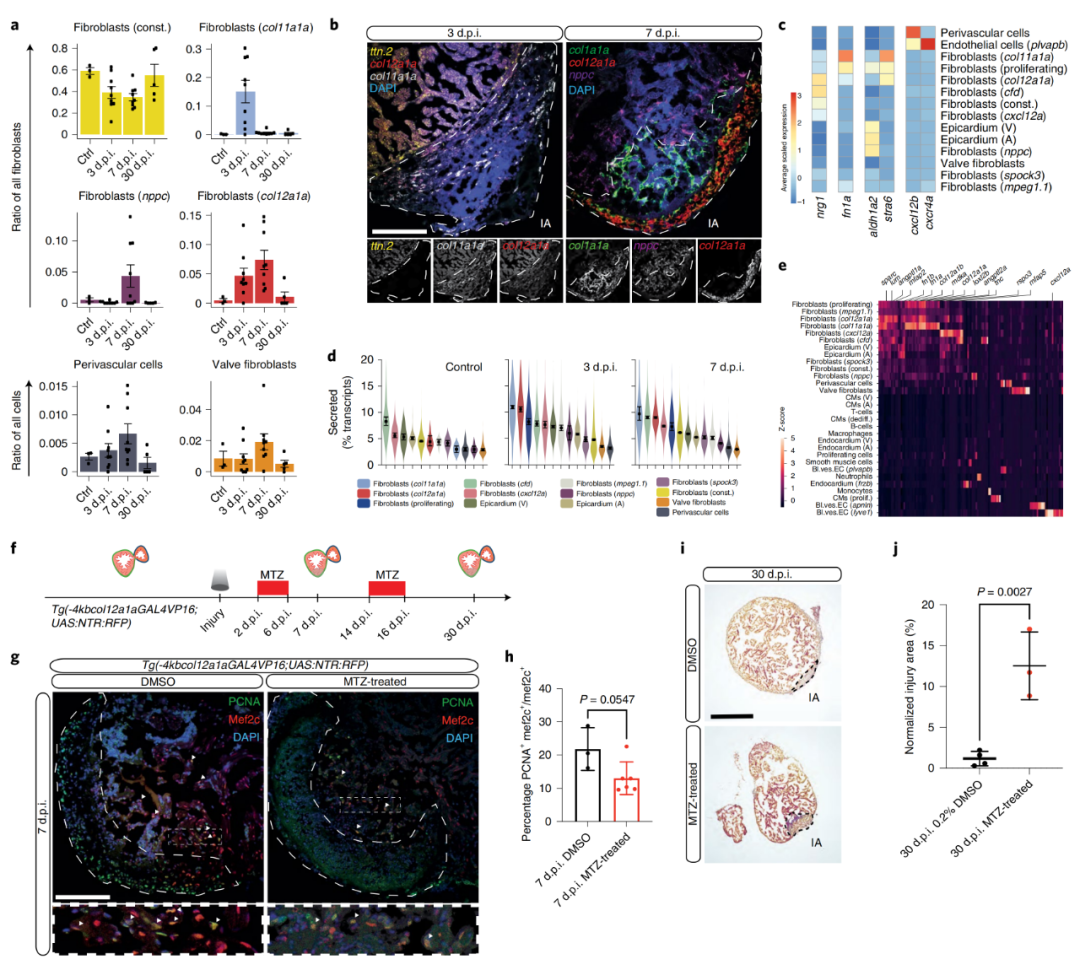雖然作者對單細(xì)胞基因表達(dá)譜的時(shí)空分析強(qiáng)烈表明了瞬時(shí)成纖維細(xì)胞的再生功能,但還需要額外的實(shí)驗(yàn)來驗(yàn)證這一假設(shè)。為了從功能上評估瞬時(shí)col11a1a和col12a1a成纖維細(xì)胞的作用,作者使用硝基還原酶/甲硝唑(NTR/MTZ)系統(tǒng)進(jìn)行靶向細(xì)胞剔除。在MTZ處理后的轉(zhuǎn)基因系Tg(-4kbcol12a1a:GAL4VP16;UAS:NTR:RFP)中,在7 d.p.i.時(shí)相較于對照,5 / 6的心臟顯示心肌細(xì)胞增殖減少,col12aa表達(dá)細(xì)胞減少(圖3g,h)。在30d.p.i.時(shí),col12a1+細(xì)胞剔除顯著損害心臟再生(圖3i,j)。總之,作者確定了心臟再生過程中具有潛在再生作用的三種成纖維細(xì)胞狀態(tài):col11a1a、col12a1a和nppc成纖維細(xì)胞?;蚣?xì)胞剔除數(shù)據(jù)強(qiáng)烈表明col12a1a表達(dá)細(xì)胞在再生生態(tài)位中發(fā)揮了作用。